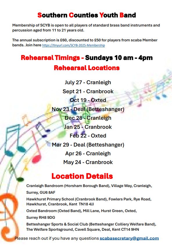 Huge thanks to Betteshanger, Cranbrook, Horsham and Oxted Bands for the kind use of their rehearsal facilities and gear.